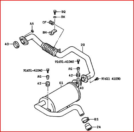 Tłumik do wózka widłowego TOYOTA 5FG/FD 20-30. Pasuje do tonaży od 2 do 2,8 tony. Na schemacie pozcja 01.